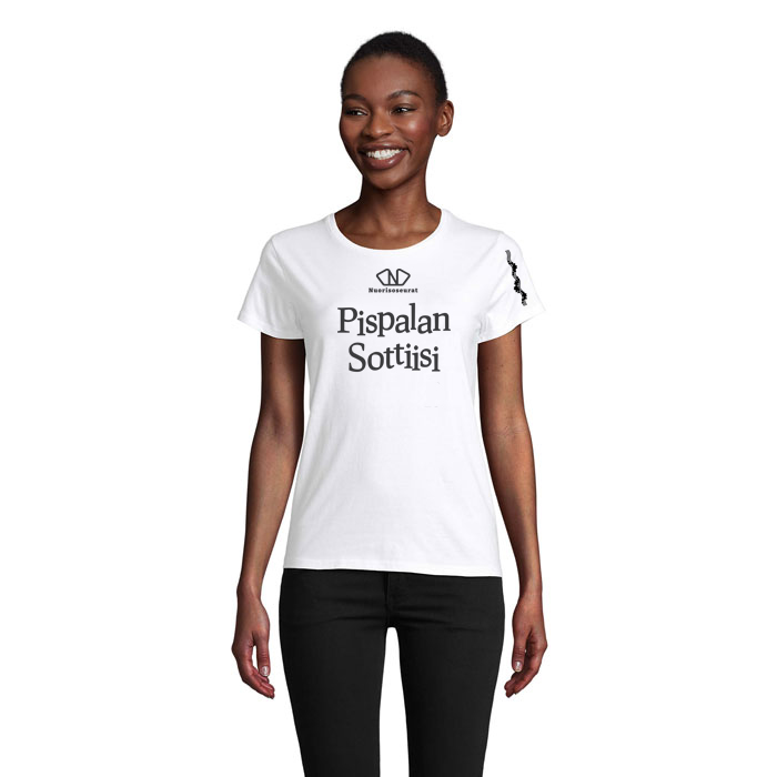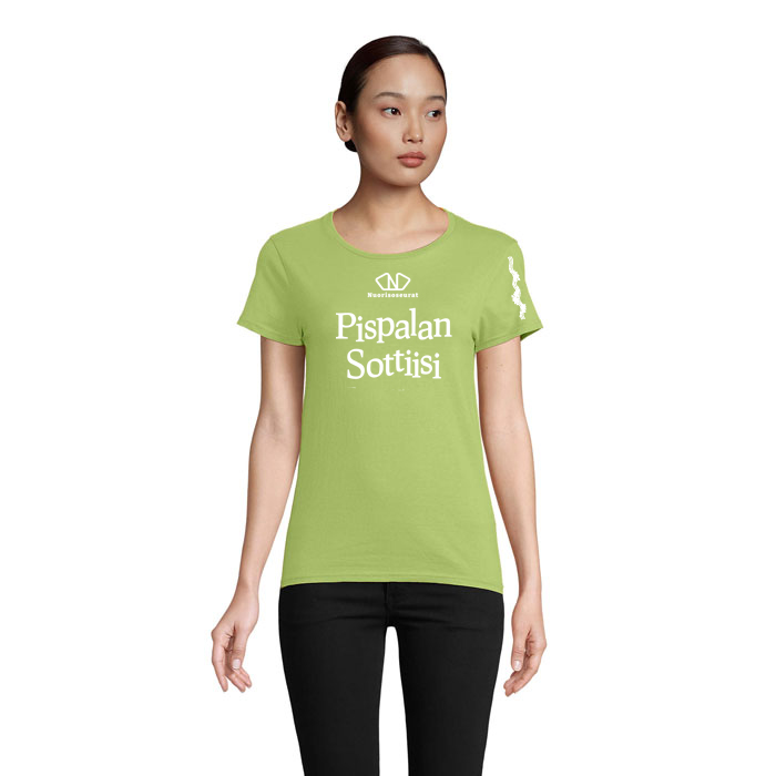 Naisten pyöreä kaula-aukkoinen, istuva Jersey t-paita, 100 % luomupuuvillaa. Luonnollinen viimeistely pehmeämmän ja sileämmän tuntuman takaamiseksi JERSEY 175, 100 % puuvillaa, joustikaulus, pyöreä kaula-aukko, kaula-aukko, istuva leikkaus, putkimainen.